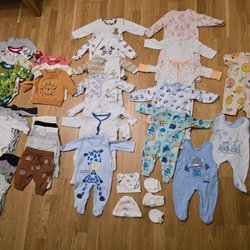 Ett stort paket med babykläder i olika storlekar och stilar. Inkluderar bodys, byxor, tröjor, sparkdräkter, shorts, strumpor och en skötväska.