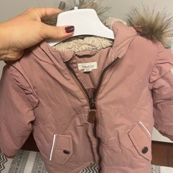 En ljusrosa jumper med kaninmönster och krage st:50. En lila klänning med blommönster och spetsdetaljer st:56.
