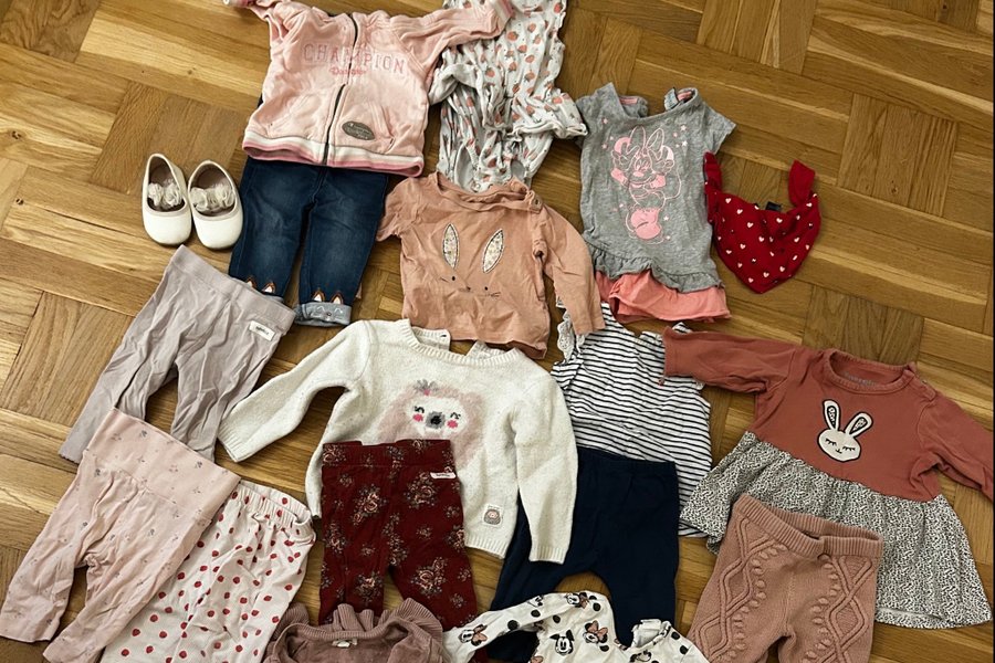 Barnklädespaket med blandade plagg. Innehåller tröjor, byxor, klänningar och koftor i olika mönster och färger.