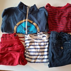 Säljer ett gäng fina barnkläder i storlek 98. Det ingår en randig tröja, en röd tröja med tryck, en grön tröja med tryck, en svart tröja med tryck, en brun tröja med tryck, ett par gröna byxor, ett par beige byxor med tryck och ett par svarta byxor. Alla kläder är i fint skick.