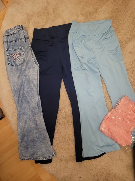 Här är ett set med tre par byxor i olika stilar och färger. Ett par är ljusblå jeans med utsvängda ben och en söt rosett på bakfickan. De andra två paren är träningsbyxor, ett par i marinblått och ett par i ljusblått. Dessutom ingår en rosa tröja.Stl 128/130.