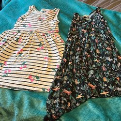 Ett set med två söta klänningar. Den ena är en röd och vit rutig klänning med ett rött band i midjan. Den andra är en rosa randig klänning med vita detaljer och ett brunt rep som bälte.
