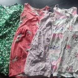 Ett klädpaket med blandade plagg. Innehåller bland annat en vit klänning med svarta prickar och ränder, leggings, tröjor och bodies med olika tryck.
