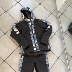 Ett set med en röd jacka och ett par svarta byxor med hängslen. Jackan har en dragkedja fram och muddar vid handlederna och halsen. Byxorna har justerbara hängslen och resår vid bensluten. Byxorna är så gott som nya, jackan är i fint skick