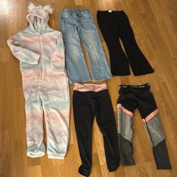 Ett set med kläder för barn. Inkluderar tröjor med lång ärm och byxor i olika färger och mönster.