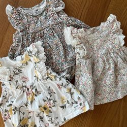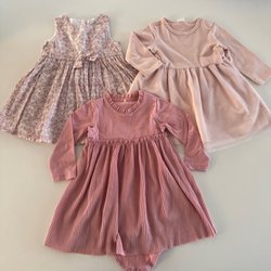 Ett paket med tre söta klänningar för barn. En rosa klänning med Minion-tryck, en vit klänning med fjärilsmönster och en ljusrosa klänning med kattmönster.
