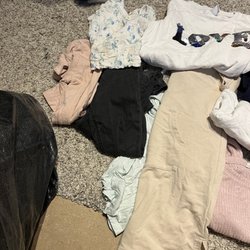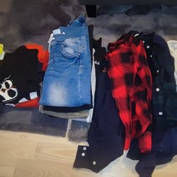 2 T-shirts och ett linne 122/128 den svarta 134 men är lika stor som 122/128. På den gula har fållen på ärmen lossnat lite i tråden.