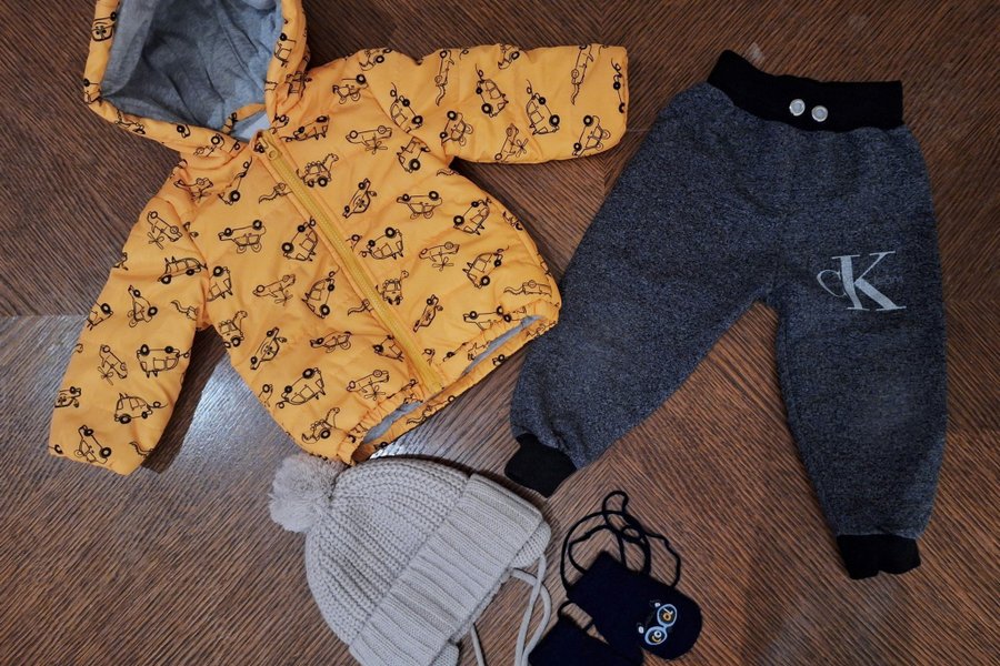 Ett set med en gul jacka med tryck, ett par grå byxor med en Calvin Klein Jeans logga, en stickad mössa och ett par vantar.
