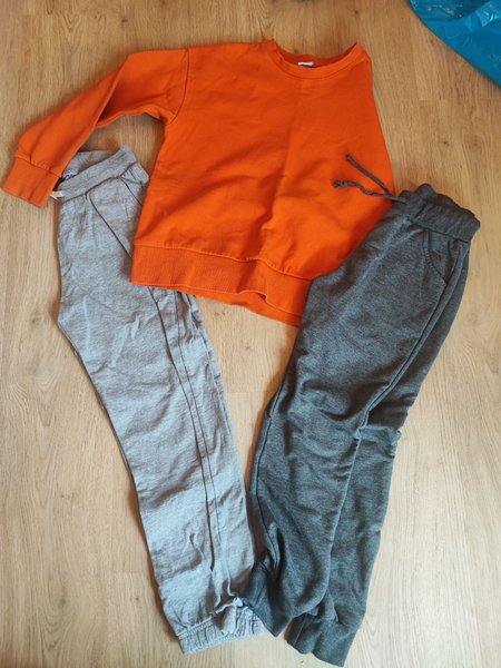 Ett set med en orange tröja och två par grå byxor. Ett par byxor är ljusgrå och det andra paret är mörkgrå.