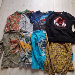 Ett paket med blandade tröjor i olika färger och modeller. Innehåller både långärmade och kortärmade tröjor samt sweatshirts och hoodies med olika tryck och mönster.