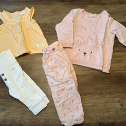 Detta är ett klädpaket med olika barnkläder. Paketet innehåller en långärmad tröja med ett lama-mönster, en mörkblå tröja, en grön långärmad tröja med ett lejonmotiv, en rödbrun t-shirt samt en grön fleecejacka.