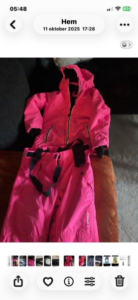 Ett set med jacka och byxor i rosa färg. Byxorna har hängslen.