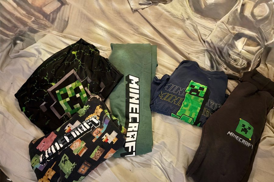 Här är ett set med Minecraft-kläder. Setet innehåller byxor och en tröja med Minecraft-tema.