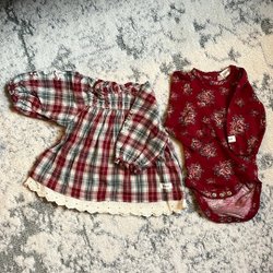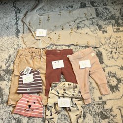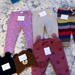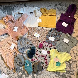 Ett klädpaket med olika barnkläder. Innehåller byxor, tröjor, klänningar och en hatt. Storlekarna varierar.
