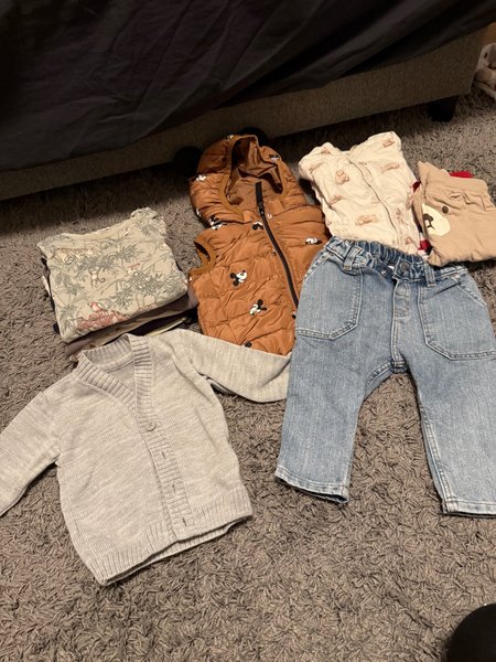 Ett klädpaket med en grå cardigan, en brun väst med dragkedja och Mickey Mouse-motiv, ett par ljusblå jeans, en vit pyjamas med björnar och en stapel med tröjor med djungelmotiv.