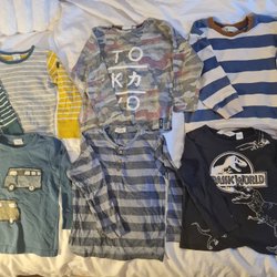 Ett paket med fem tröjor i olika färger. Inkluderar en gul tröja från H&M, en brun tröja med detaljer, en rosa hoodie, en blå hoodie och en svart hoodie.