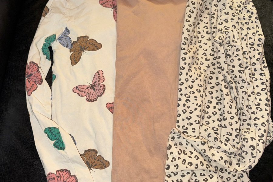 Detta är ett set med tre överdelar. En långärmad tröja med fjärilsmönster i rosa, grönt och brunt. En enfärgad långärmad tröja i en ljusbrun nyans. Samt en långärmad tröja med leopardmönster i svart och vitt.