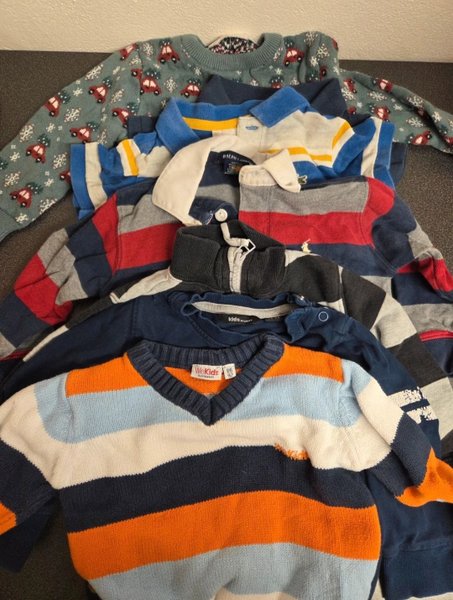 Ett paket med blandade tröjor och pikétröjor för barn. Inkluderar en grön stickad tröja med bilar, en randig pikétröja, en tröja med dragkedja och en randig V-ringad tröja.