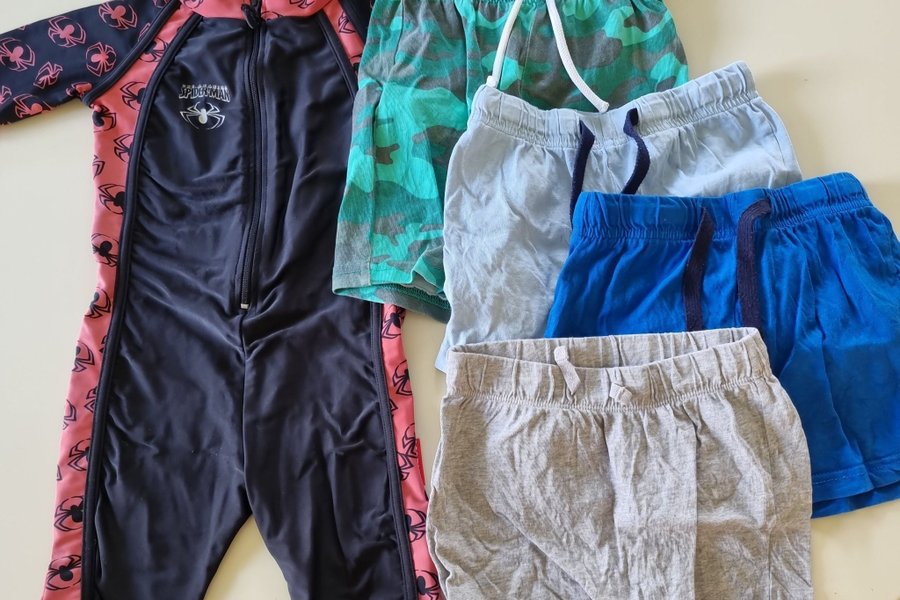 Inkluderar en Spiderman-baddräkt med dragkedja framtill och tryck av spindlar längs ärmarna och sidorna (ej UV-klassad och lite genomskinlig i ryggen). Dessutom ingår fyra par shorts i olika färger och mönster: grön kamouflage, ljusblå, kungsblå och grå.