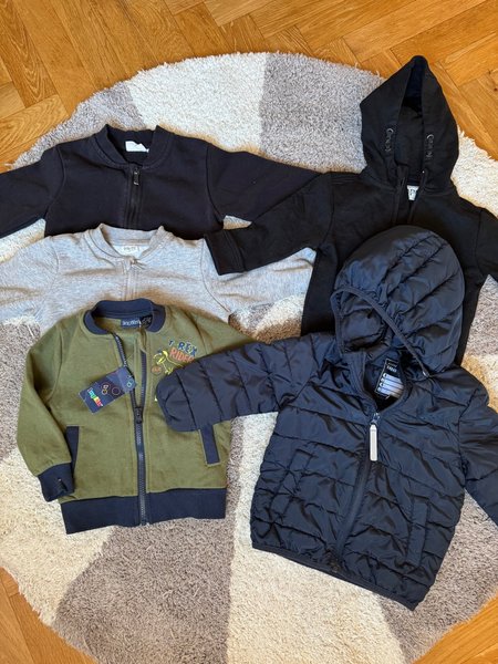 Ett paket med fem olika jackor för barn. En svart bomberjacka, en grå sweatshirtjacka, en grön bomberjacka med dinosauriemotiv och en svart vadderad jacka med huva.