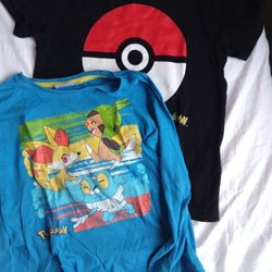 Lite slitage på knäna, men hela. Fläckar finns på byxorna. Helt tryck på tröjan.