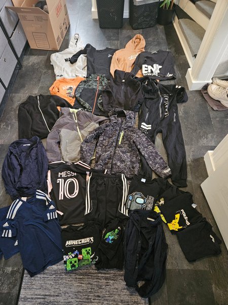 7 Tröjor, 6 t-shirts, 1 pyjamaser, 1 softshelljacka, 1 tunnare vårjacka, 1 fleecetröja, 2 skjortor, fotbollskläder. (1 set Adidas mörkblåa, 1 tränings t-shirt Messi och 1 par svarta Adidas shorts som passar till Messi t-shirten), 1 onepeace woxo,