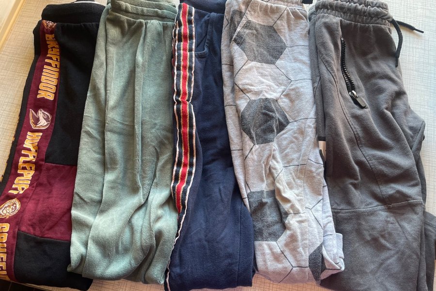 Her er et sæt med fem par bukser. Et par er sorte og bordeaux med Harry Potter Hufflepuff-tema. Et par er lysegrønne, et par er mørkeblå med en stribe i siden, et par er grå med et fodboldmønster og et par er mørkegrå med lynlås.