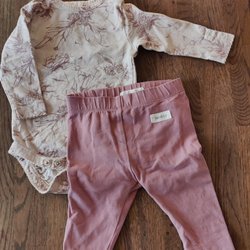 Set med en stickad klänning och ett par mönstrade byxor. Klänningen har långa ärmar och en rund halsringning.