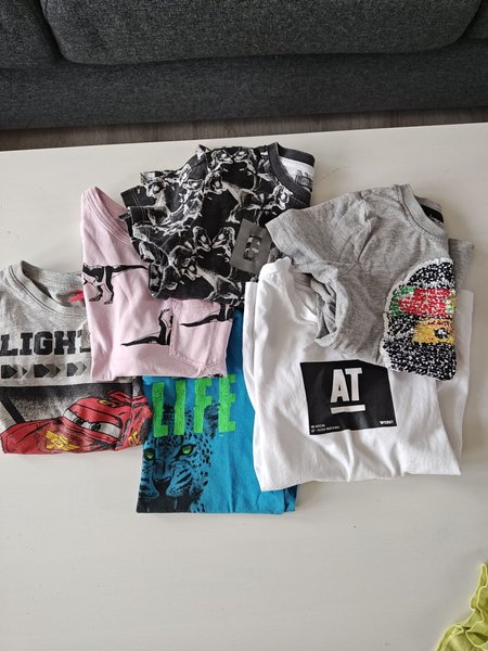 Ett paket med sex olika t-shirts för barn. En ljusrosa och en svart t-shirt med dinosauriemotiv, en grå t-shirt med blixten McQueen från Disney Cars, en blå t-shirt med ett leopardansikte, en vit t-shirt med texten "AT" och en grå t-shirt med ett vändbart paljettmotiv av en ninja i Ninjago.