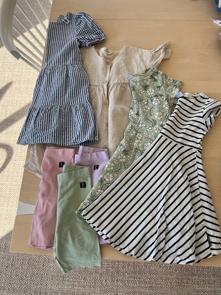 Jättefina barnkläder. En blåvitrandig klänning med korta puffärmar och volangdetalj nedtill (Rikiki). En beige linneklänning med knappar framtill och volangärmar. En grönmönstrad klänning med korta ärmar. En blåvitrandig klänning med korta ärmar och utsvängd kjol. Tre par enfärgade shorts i rosa, lila och ljusgrönt.