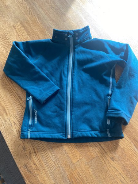 En grön fleecejacka med dragkedja framtill och två fickor med dragkedja i sidorna. Jackan har en hög krage med tryckknappar. Tumhål vid ärmsluten. Luvan saknas,