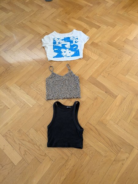Denna annons inkluderar tre toppar. En vit kortärmad topp med ett blått tryck av ansikten, stl 140,ett leopardmönstrat linne med smala axelband i stl 134/140 från H&M och en svart ribbad top från Zara i stl S