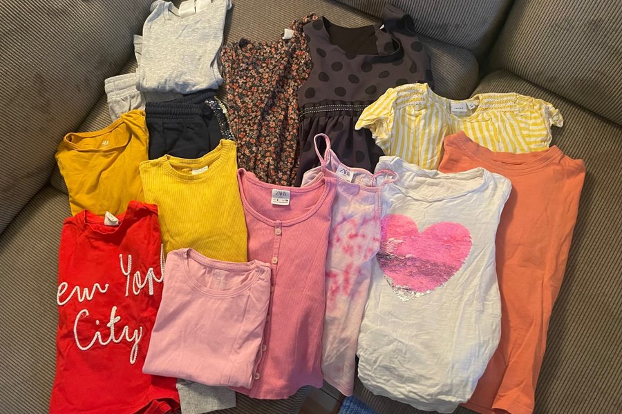 1 par mjukisbyxor (H&M), 1 par shorts (mango), 2 klänningar (långärmad Zara kortärmad Mywear), 1 blus (Name it), 4 T-shirts (H&M, Minimarket, Zara), 1 linne (Zara) 3 långärmade bomullströjor (H&M, Zara)