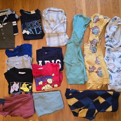 Detta är ett klädpaket för barn. Det innehåller byxor i olika nyanser av blått och svart, inklusive manchesterbyxor. Det finns också skjortor och tröjor i färger som ljusblått, svart och gult, med både enfärgade och mönstrade alternativ.