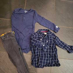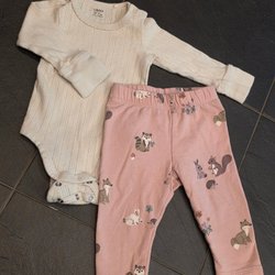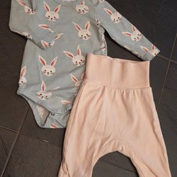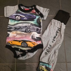 Ett set med en röd body med tryck av en racerbil och texten "Monte Carlo Racing". Till detta ett par ljusblå byxor med muddar och dragsko i midjan.