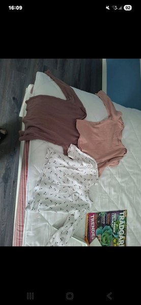 Ett set med tre långärmade toppar. En enfärgad brun topp, en enfärgad rosa topp och en vit topp med körsbärsmönster. Perfekt för vardagsbruk.