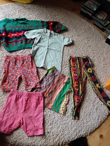 Ett paket med blandade barnkläder. Innehåller en grön stickad tröja med mönster, en ljusblå t-shirt, ett par röda blommiga byxor, ett par färgglada shorts och ett par mönstrade legging rosa shorts