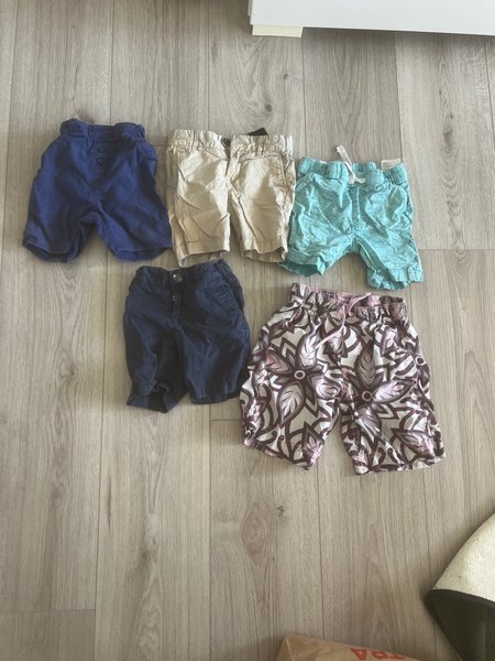 Allt på 75 :-Ett par mörkblå shorts med knappar framtill. Ett par beiga shorts med knappar framtill. Ett par ljusblå shorts med hajmönster och dragsko i midjan. Ett par mörkblå shorts med knappar framtill. Ett par mönstrade shorts i brunt, rosa och vitt med dragsko i midjan.