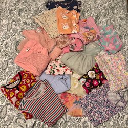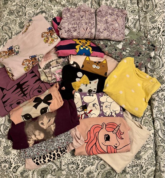 Ett paket med långärmade tröjor med olika tryck som Paw Patrol, Bamse, katter, Mumin och enhörning. Även en blommig jacka och en grön tröja med djurmönster ingår. Färgerna varierar från rosa, lila, gul, svart och vinröd.