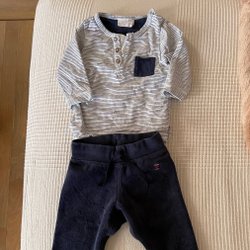 Ett set med bodys i olika färger och mönster. Setet innehåller en vit, en blå, en grön och en mörkblå body. En av dem har ett tryck med fordon.
