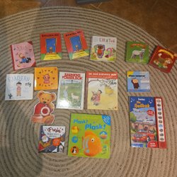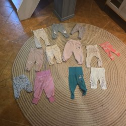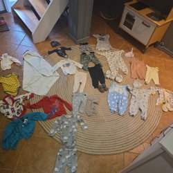 Ett parti med babykläder och skor. Partiet innehåller flera olika plagg som one piece, jackor, västar och overaller i olika färger och mönster. Det finns även ett urval av skor i olika storlekar och stilar.