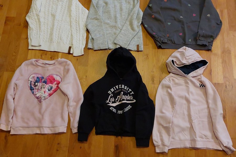 Ett paket med sex tröjor för barn. En vit stickad tröja med flätmönster, en ljusgrå stickad tröja, en mörkgrå sweatshirt med små hjärtan i olika färger, en rosa sweatshirt med ett stort My Little Pony-tryck i hjärtform, en svart hoodie med texten "UNIVERSITY Los Angeles" och en ljusrosa hoodie. Djur och rökfritt hem.