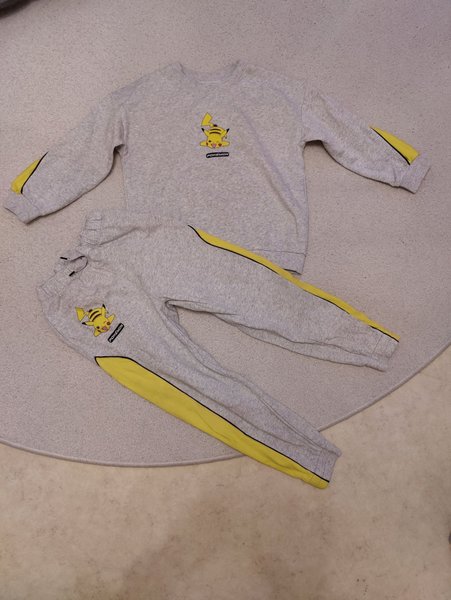 Mjukisset med tröja och byxor. Tröjan har långa ärmar och rund hals. Byxorna har resår i midjan och muddar vid bensluten. Både tröjan och byxorna har ett tryck av Pikachu och gula detaljer längs ärmarna och sidorna.
