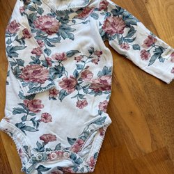 Ett set med babykläder, inklusive bodys och byxor i olika färger och mönster. En gul overall med vattenmelonmönster ingår också. Newbie, H&M, Name it...