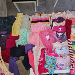Ett stort parti med barnkläder, inklusive jackor, byxor, tröjor och skor. Kläderna är i olika färger och stilar, lämpliga för olika väderförhållanden.
