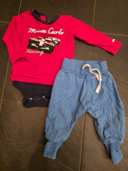 Ett set med en röd body med tryck av en racerbil och texten "Monte Carlo Racing". Till detta ett par ljusblå byxor med muddar och dragsko i midjan.