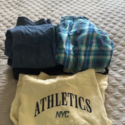 Ett randigt pyjamasset med långärmad tröja och byxor. Setet har vita och marinblå ränder och marinblå muddar. Är i fint skick, ej sliten. Hel och ren. Allergivänliga och parfymfri hem