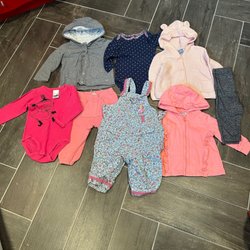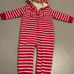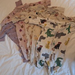 Ett set med två babyplagg. En pyjamas med fötter, prydd med ett kattmönster i svart och vitt, samt detaljer i rosa. Står storlek 9 månader, men använd som 62. Den andra är en pyjamas med långa ärmar, dekorerad med ett molnmönster i ljusblått där benen blir mysigt inne i påsen. Knappar nertill för lätt blöjbyte (storlek 62-68).