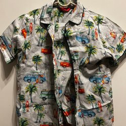 Här är ett set med 2 pyjamasar och en pyjamasbyxor . Den första pyjamasen är mörkblå med ett cirkusmönster med elefanter, tigrar, luftballonger och tält. Den andra pyjamasen är grönblå med ett hundmönster. pyjamasbyxan är grå och vit rutig.