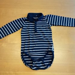 Blå pyjamas med stjärnor och knappar framtill. Baktill vid grenen är det en maska som gått, se bild. På ena ärmen finns en liten fläck.